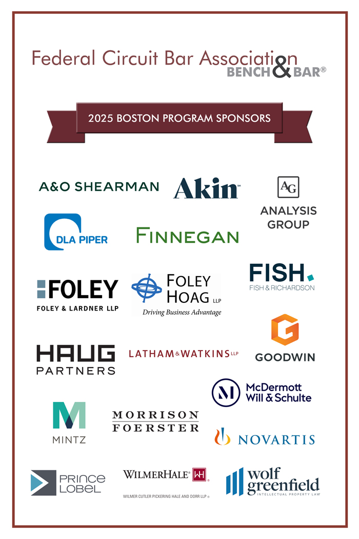 The Federal Circuit Bar Association® (FCBA) will host a Continuing Legal Education (CLE) program on October 7, 2025, at the Harvard Club of Boston. This special event, which coincides with the Federal Circuit’s Court Week in Boston, MA, will bring together esteemed judges from the U.S. Court of Appeals for the Federal Circuit (CAFC) and other courts including the U.S. Court of Appeals for the First Circuit, the U.S. District Court for the District of Massachusetts, and distinguished members of the legal and academic community. Thought leaders will discuss such topics as what makes Boston a leading hub for innovation and emerging trends in patent litigation. This program will include a CAFC Judicial panel discussion and culminate with a Fireside Chat featuring the Chief Judges of the Federal and First Circuit Courts of Appeals. Do not miss this rare opportunity for dialogue between the bench and bar on important issues impacting the Federal Circuit community and beyond.