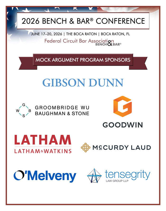 The 2026 Bench & Bar® Mock Argument will be held on Wednesday, June 17, 2026, at The Boca Raton in Boca Raton, FL. Rising advocates present oral arguments to and receive real-time insights from federal judges and leaders of the appellate bar. The mock exercise will consist of a mini-appellate argument involving issues of patent law.