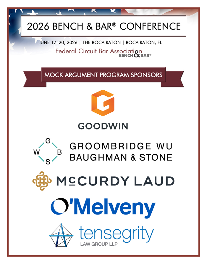 The 2026 Bench & Bar® Mock Argument will be held on Wednesday, June 17, 2026, at The Boca Raton in Boca Raton, FL. Rising advocates present oral arguments to and receive real-time insights from federal judges and leaders of the appellate bar. The mock exercise will consist of a mini-appellate argument involving issues of patent law.